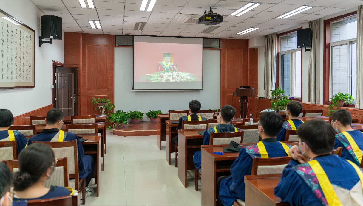 各位毕业生在毕业宣传视频的伴随下,有序步入分会场,观看毕业典礼转播。