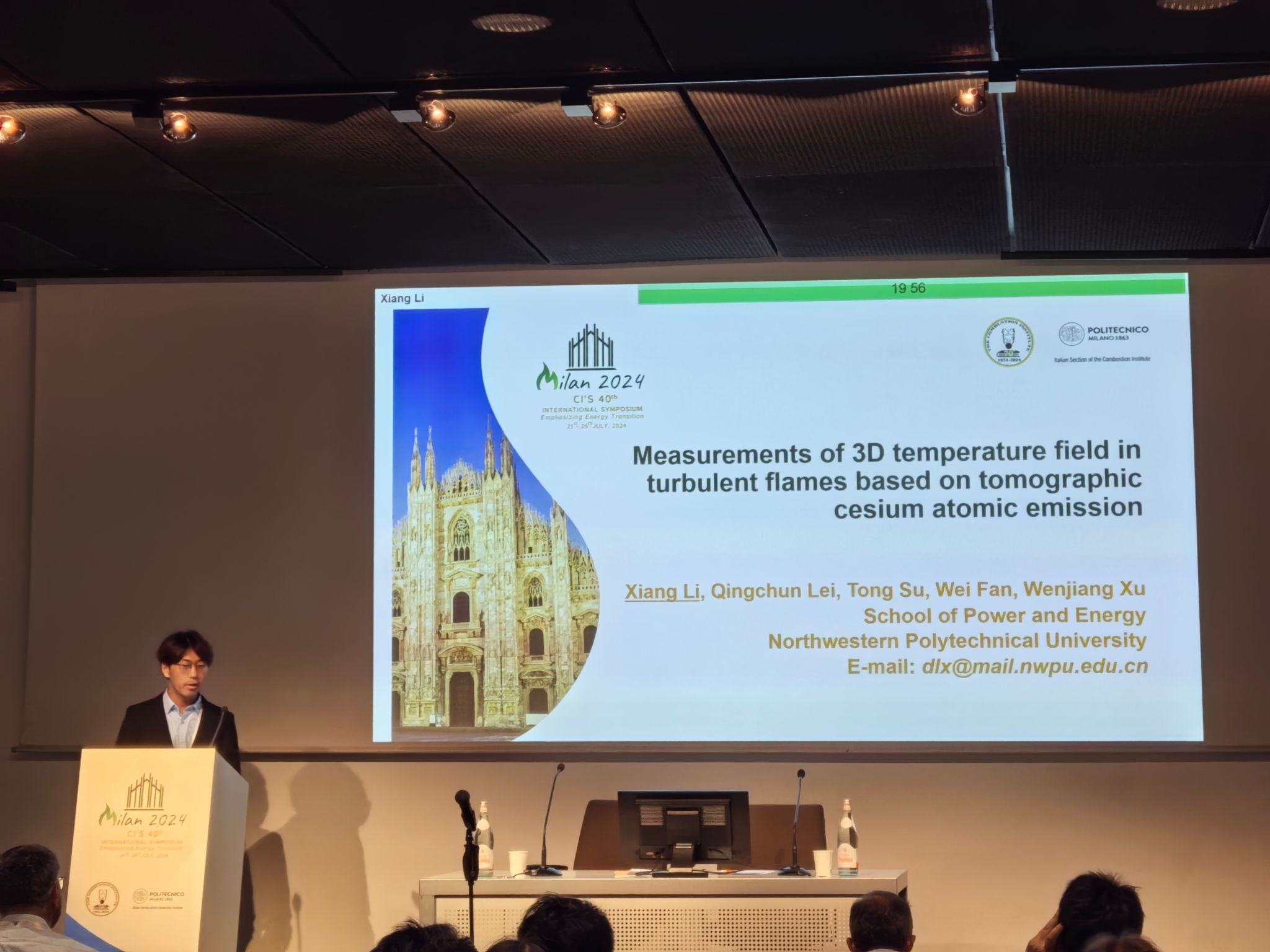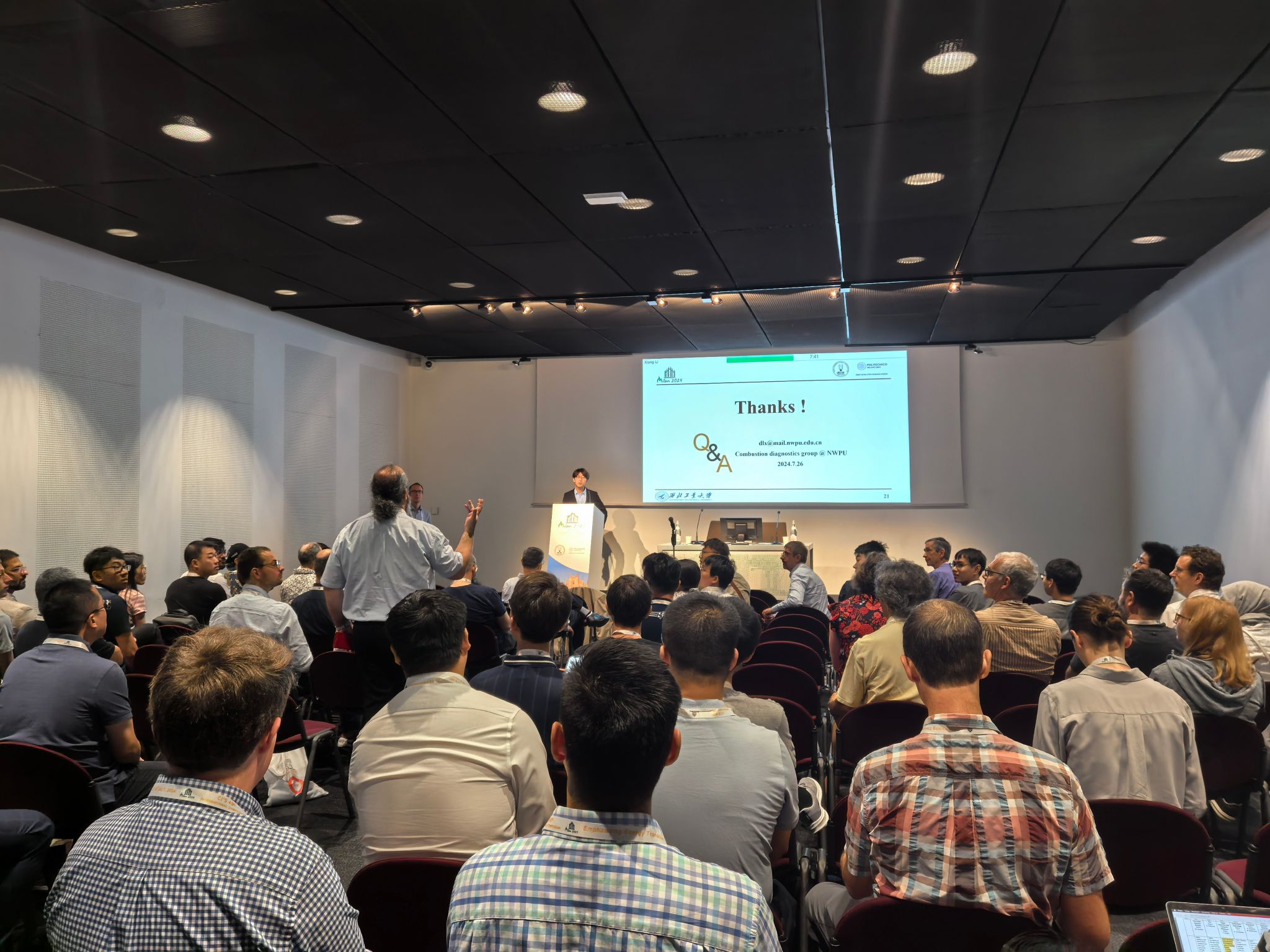 博士生李响在Diagnostics分会场做了题为“Measurements of 3D temperature field in turbulent flames based on tomographic cesium emission”的口头汇报。汇报以燃烧诊断领域广受关注的温度场测量为背景,首次提出利用铯原子发射光谱和计算层析成像技术,实现湍流火焰的高分辨三维温度场测量。该技术无需使用高能激光和像增强器等设备,克服了传统测温技术面临的一系列难题,为真实环境的高温测量提供了强有力的手段。汇报内容受到同行的广泛关注与积极评价,现场座无虚席,反响热烈。 (论文原文://doi.org/10.1016/j.proci.2024.105246)