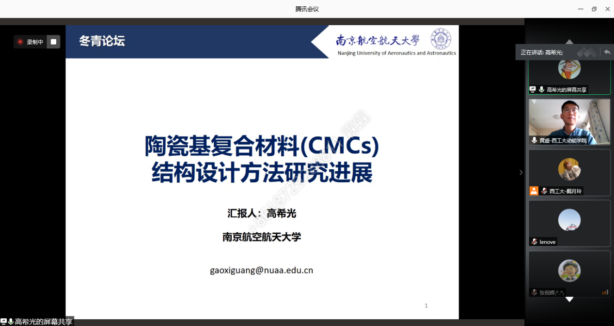 应冬青学会邀请,2020年11月21日,北京理工大学梁军教授和南京航空航天大学高希光教授分别针对复合材料研究中的热点和难点问题,对《先进复合材料异形结构力学性能表征与评价》和《陶瓷基复合材料结构设计方法研究进展》进行了精彩讲授。