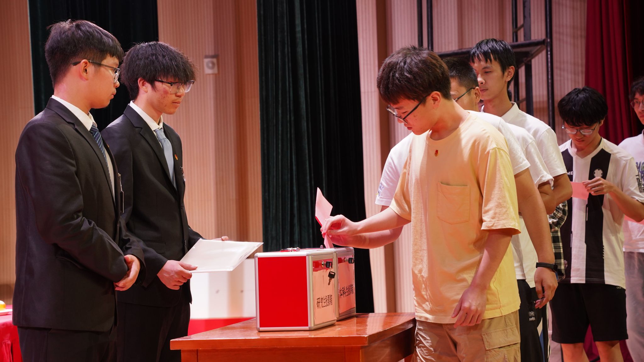 听取提案工作报告后,来自本科生和研究生代表团的青年学生代表本着公平、公正的原则,按照选举办法代表广大学生行使权利,以饱满的热情参与到投票选举环节。