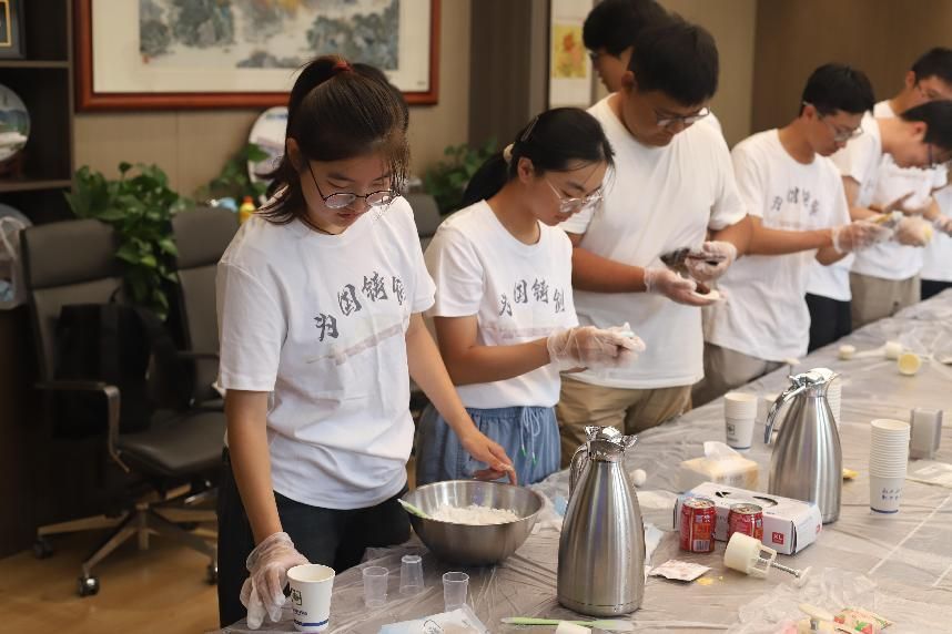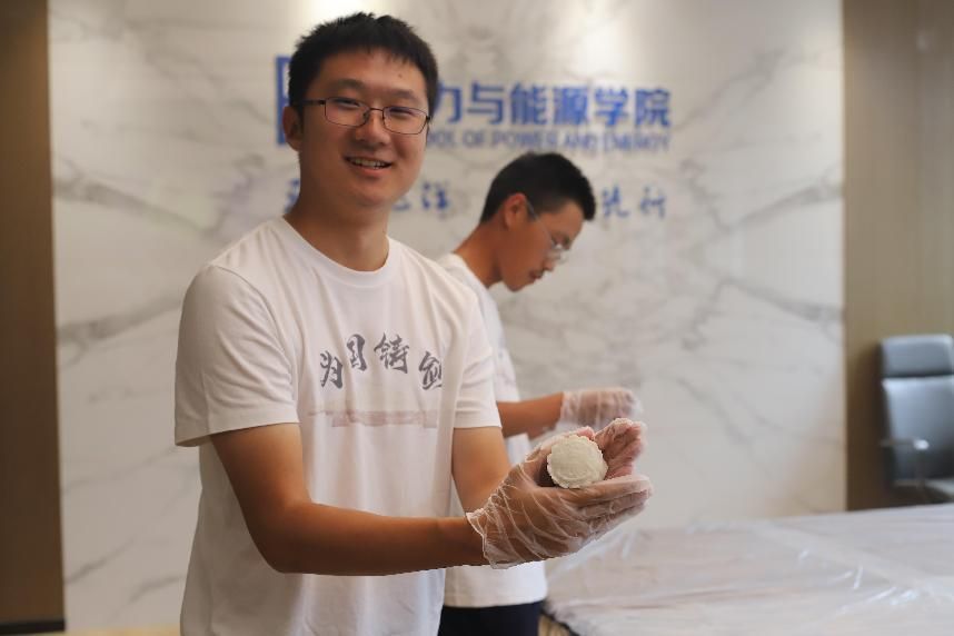 在冰皮月饼制作活动中,同学们三五成组,利用活动前期准备的原材料开始制作。从面皮的和制,馅料的选取,再到压制成型,同学们在相互对照与评比之中一次次摸索经验:面粉与水的比例应该如何分配,模具压制的力度应当是大是小等等。在不断尝试和改进中,同学们各自都做出了自己满意的月饼,有的同学单独和月饼合了影,有的同学将月饼包装好作为节日礼物赠送给朋友。