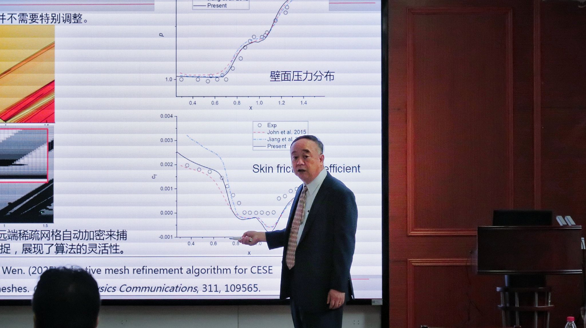 青年教师及研究生作题为《自适应算法研究进展与三维弯曲管道爆轰波仿真》的学术报告,分别介绍了自适应算法研究进展和三维弯曲管道爆轰波两个方向的研究成果。