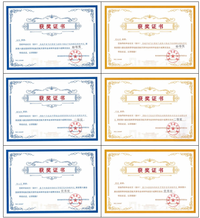 学生姬旭阳的毕业论文《涡轮叶片尾缘扰流半劈缝流动换热特性及综合冷效模化研究》(指导教师:叶林教授)获得二等奖;