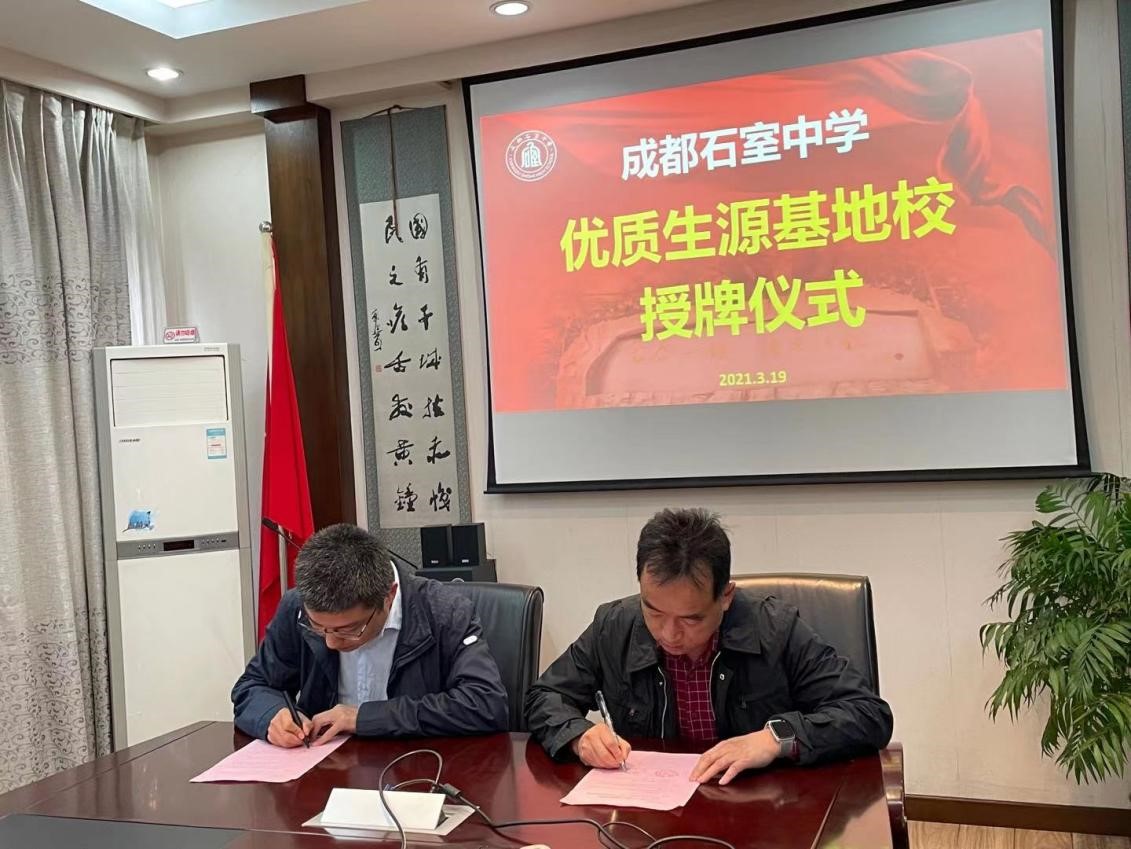 与石室中学签订了优秀生源基地协议,并进行了优质生源基地授牌仪式。