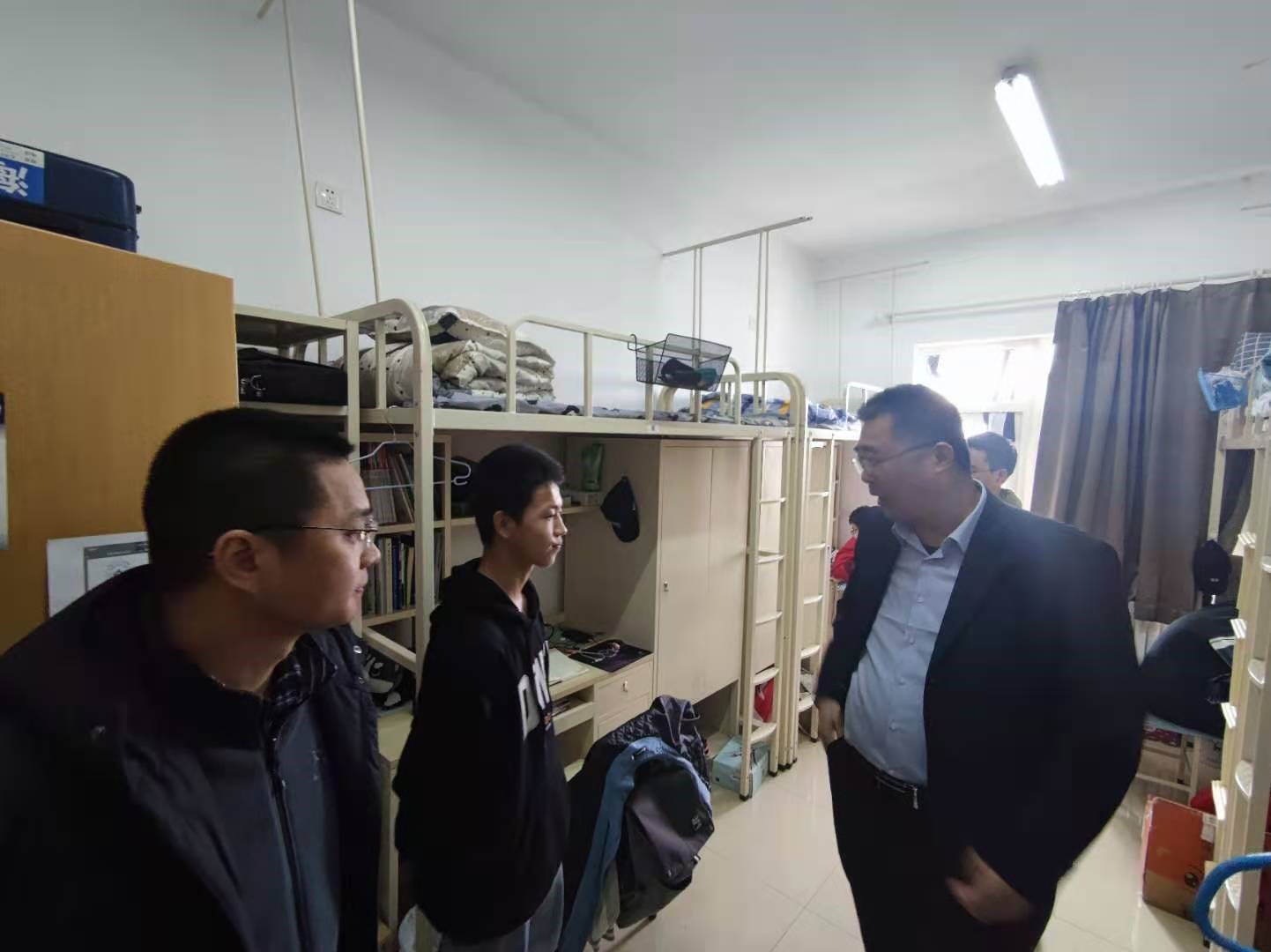 党委书记闫育周带队,党委副书记刘江以及各年级辅导员共同对本科生宿舍进行了走访,了解学生学习生活状况。