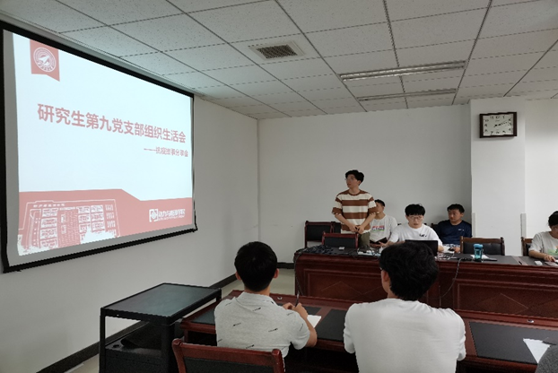 研究生第九党支部组织生活示范会,此次会议由党支部书记朱安冬主持,全体支部成员参加,其他学生支部书记列席。