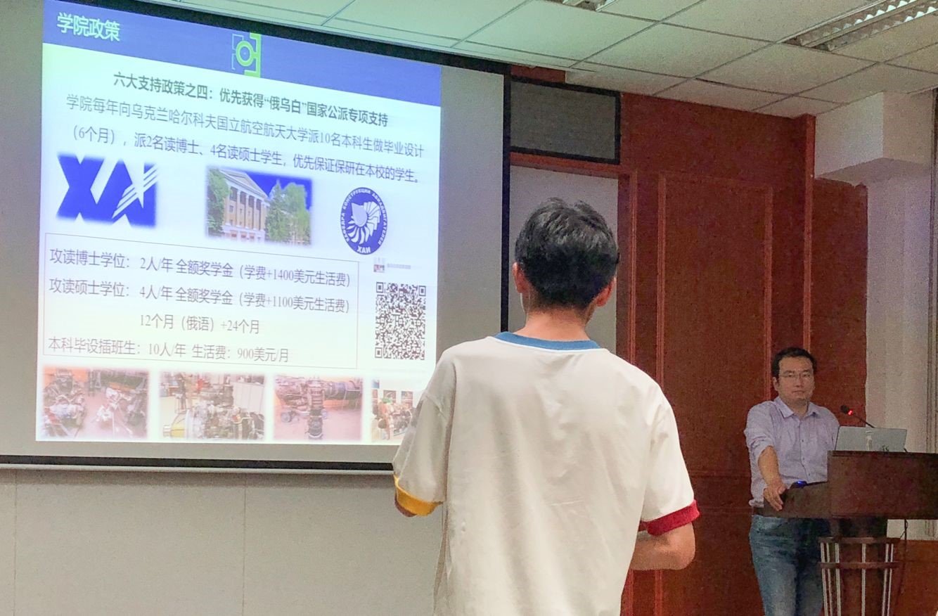 国际合作培养项目,并以“中乌先进飞行器动力技术专业人才培养项目”为例,从选派专业范围、留学单位及留学期限、申请条件及要求、申请及选拔程序等方面进行了详细的指导,就同学们提出的问题进行了答疑。