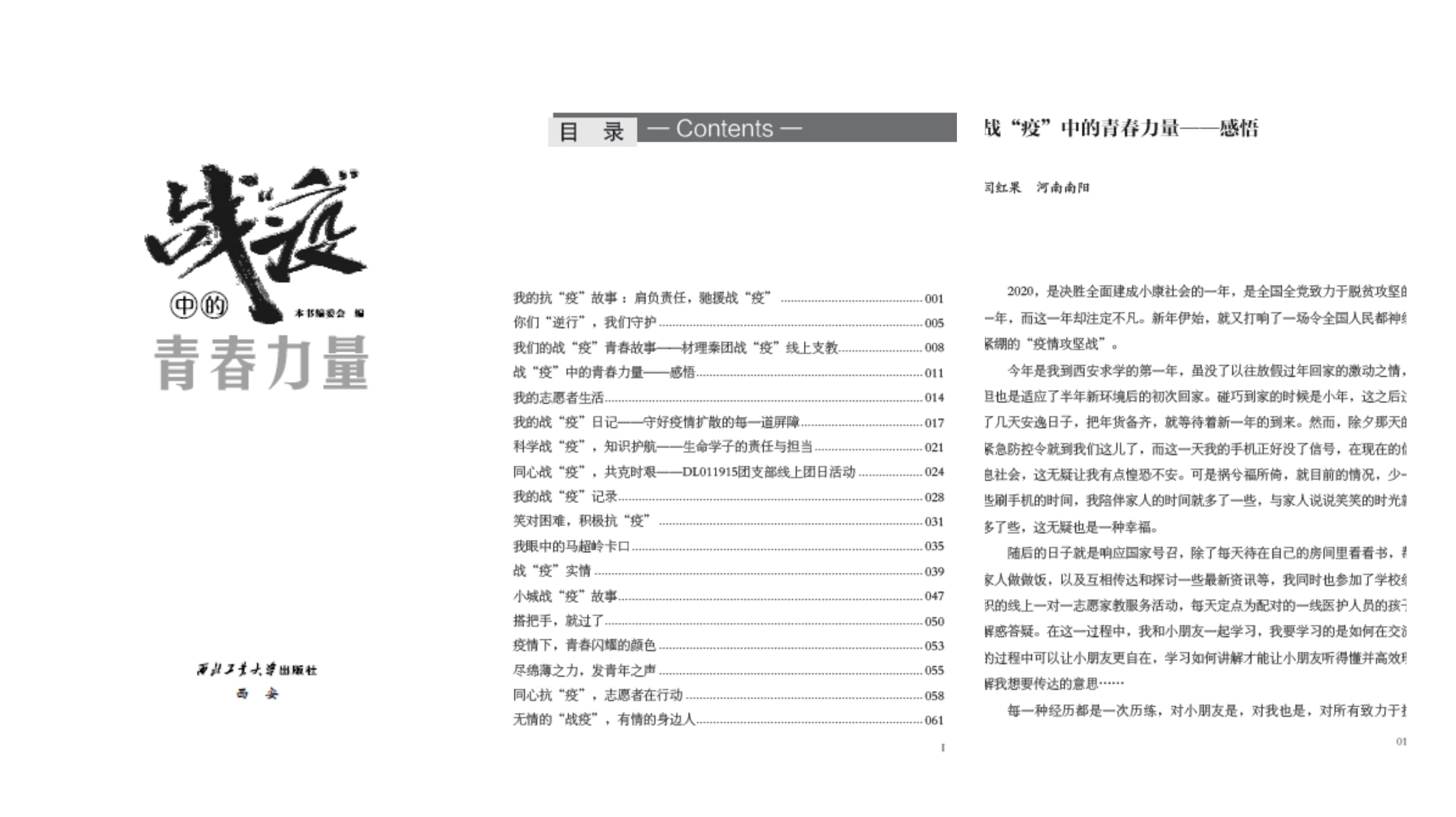 发起的“战疫中的青春力量”的倡议征稿活动,最终我有幸能够成为其中被收录的作者之一,于是就决定把它作为我的工大印记,以此来铭记2020年的不凡和我初次与工大共奋斗的历程。借此机会我也希望工大学子们能够继往开来,工大能够越来越好,让我们一起为国家和社会继续贡献出属于我们的青春力量!