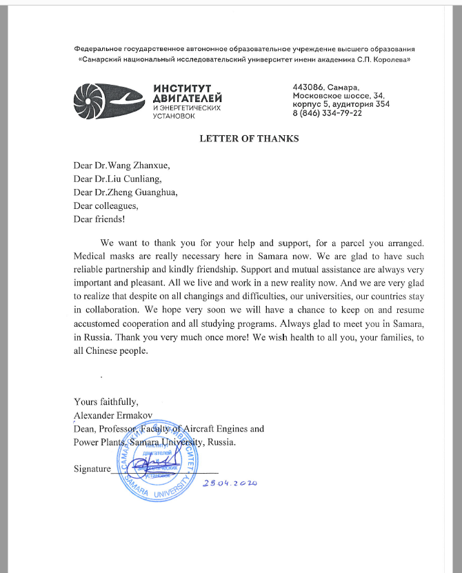 乌克兰哈尔科夫航空航天大学发来的感谢信