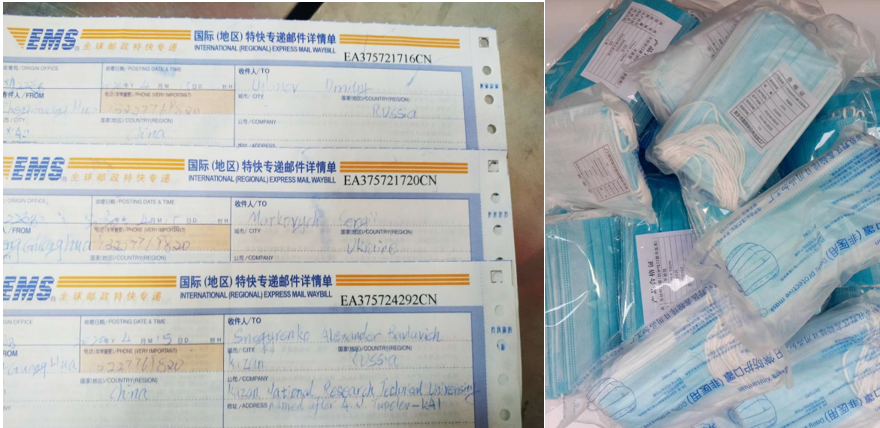 竭尽全力购买筹措防护物资,在充分了解相关国际防疫物资邮寄政策后,分别向俄罗斯喀山国立技术大学和萨马拉国家研究型大学各捐赠3000只口罩,向乌克兰哈尔科夫大学捐赠2000只口罩。