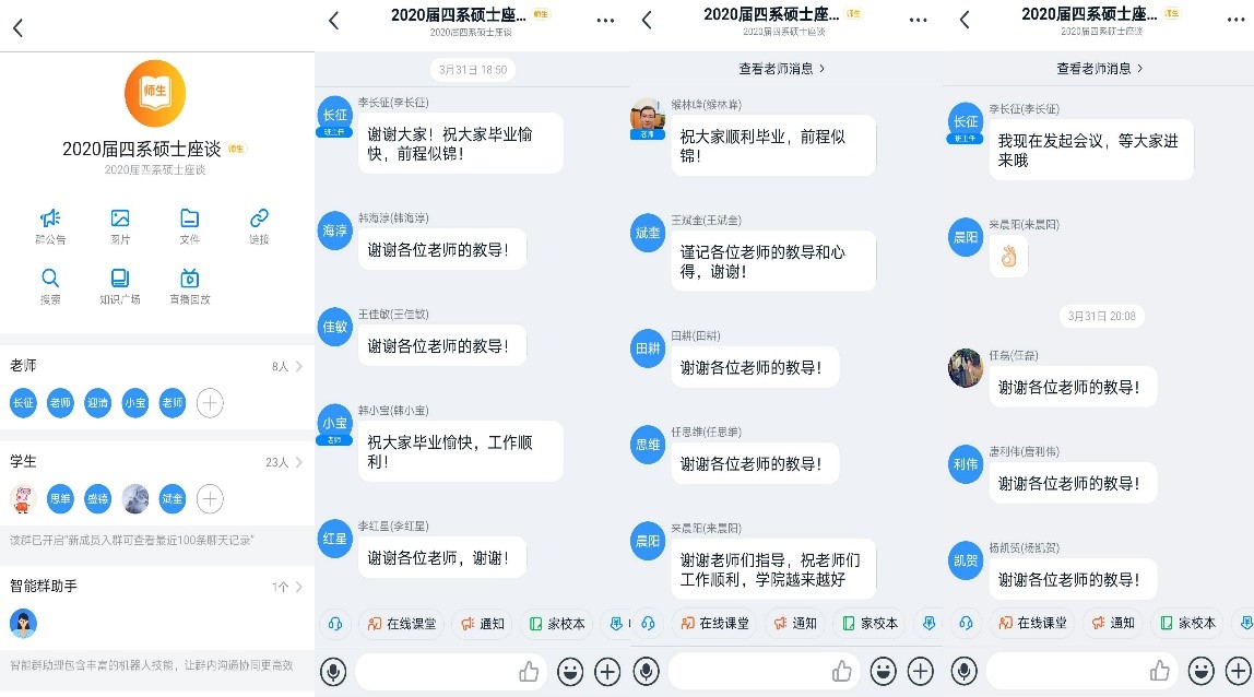 座谈会上,导师代表向所有即将毕业的同学送上了诚挚的祝贺。同时,依托线上平台,师生们畅叙离别之谊、感恩之情,诉说防疫期间的生活状态,分享读研期间的成长与感悟。同学们也对教研室、系、JavLibrary