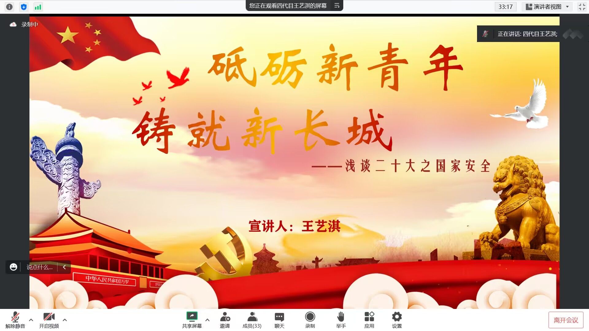 最后,王艺淇同学带领与会人员学习了党的二十大“砥砺新青年,铸就新长城——浅谈党的二十大之安全”的内容。王艺淇向同学们介绍了传统安全和非传统安全的概念,并强调了党的二十大报告中对国家安全的重视。无论是传统安全还是非传统安全,青年人都应该自觉保护,国家安全不容懈怠,青年自当坚决捍卫,铸就新长城。