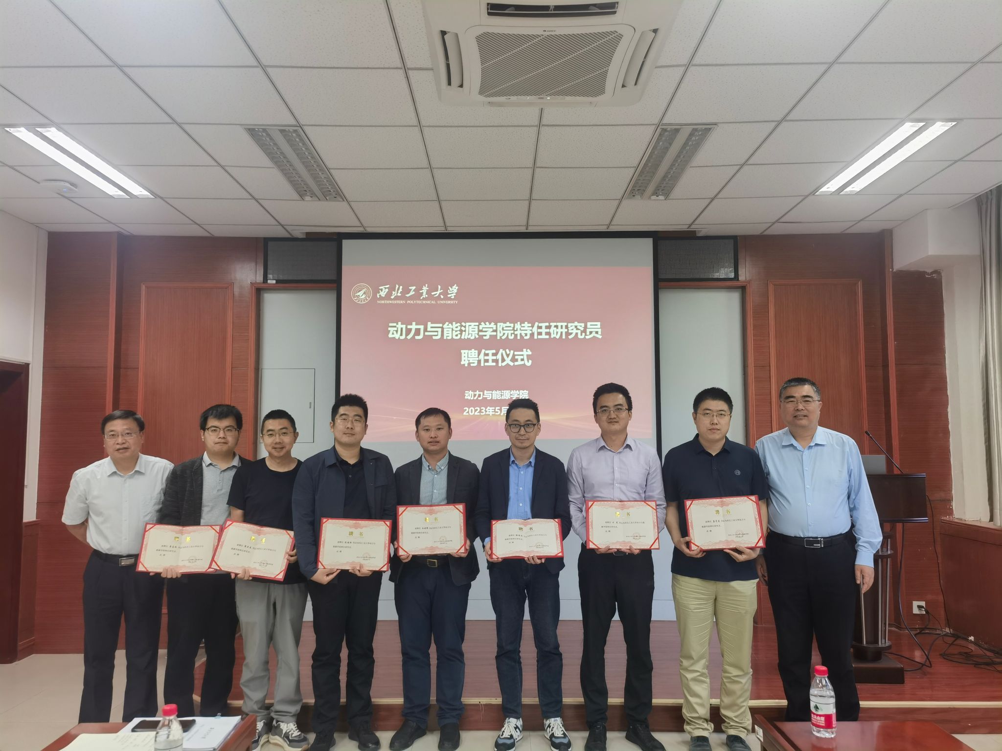 王占学与闫育周为孟宪龙、雷庆春、白晓晖、陈福振、曹志远、徐慎忍、王昊等7位长聘副教授颁发特任研究员聘书。