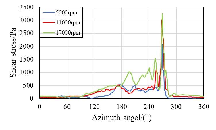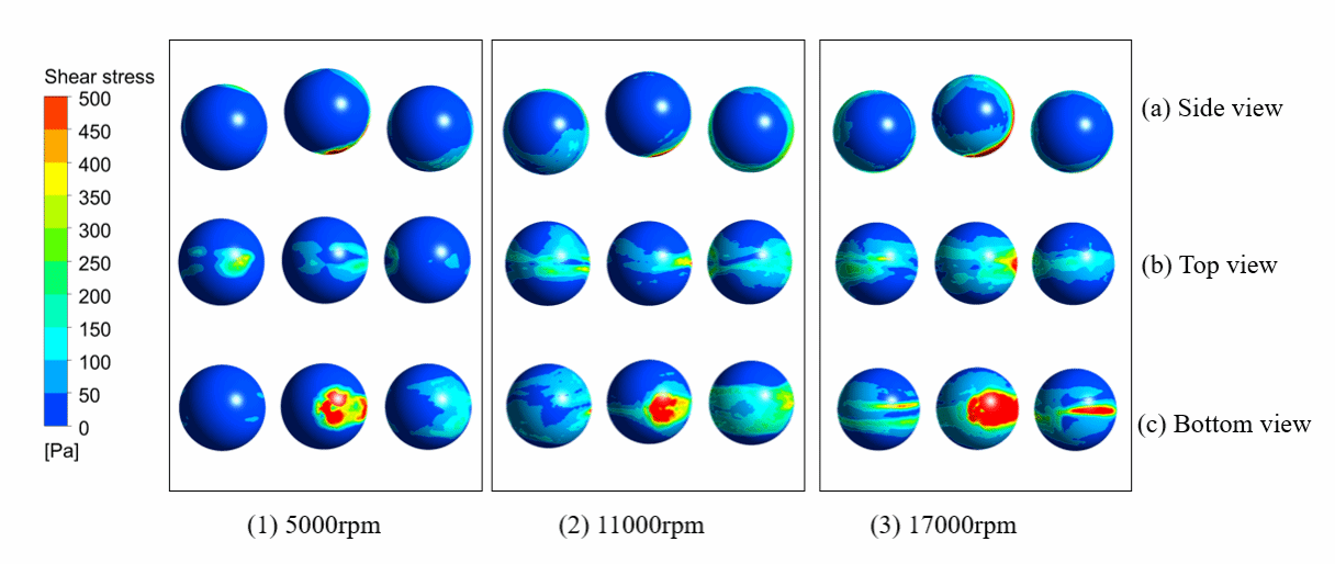 图5 不同转速下球体表面剪切应力分布