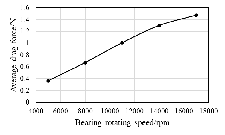 数值计算结果表明当滑油通过供油孔进入轴承时,它在球体的底部产生旋涡,然后沿着球体与保持架之间的间隙流向外环。随着轴承转速增加,轴承内流体速度也在增加,如图2所示。图3为不同轴承转速下球体表面的压力分布,轴承旋转引起的离心力导致滑油在外环附近聚集。由于球体与外环之间的间隙较小,流体速度增大,导致球体上方出现低压区。此外,内环的旋转速度大于球体公转的转速,当供油孔面向球体的底部时,滑油直接喷射到球体的表面,产生压力差,这就导致了供油孔前的低压区和供油孔后的高压区。随着轴承转速的增加,球体表面压力也在增加。从图4(a)和图4(b)中可以明显看出这一点,图4(a)为上半球的压力,图4(b)为下半球的。下半球的压差明显大于上半球的压差,当轴承转速从5000rpm增加到17000转rpm时,压差增大1.85倍。图5为不同轴承转速下球体表面的剪切应力分布,剪切应力主要集中在球体与其他部件(如内环、外环和保持架)的接触区域。环下供油孔会显著影响球体表面的剪切应力分布,从而产生更大的剪切应力。随着轴承转速增加,球体表面的剪切应力范围扩大。图6为环下供油孔面向球体底部时,由上半球到下半球360°的剪切应力。随着轴承转速增加,轴承部件的相对速度增加,导致球体表面的剪切应力增加。球体表面的压差和剪切应力形成了拖曳力,图7为不同轴承转速下单个球体旋转一周的平均拖曳力。由于滑油从环下供油孔进入轴承与内环一起旋转,因此滑油在轴承内的周向运动速度比球体公转快,导致后半球的压力比前半球大。通过分析发现拖曳力方向与球体的公转方向一致,即拖曳力是环下润滑球轴承中球体公转的驱动力,这与喷射润滑不同。当轴承转速为5000rpm时,拖曳力为0.36 N;当轴承转速为17000rpm时,拖曳力为1.47 N,增大4.08倍。