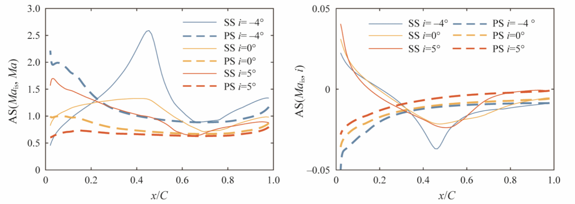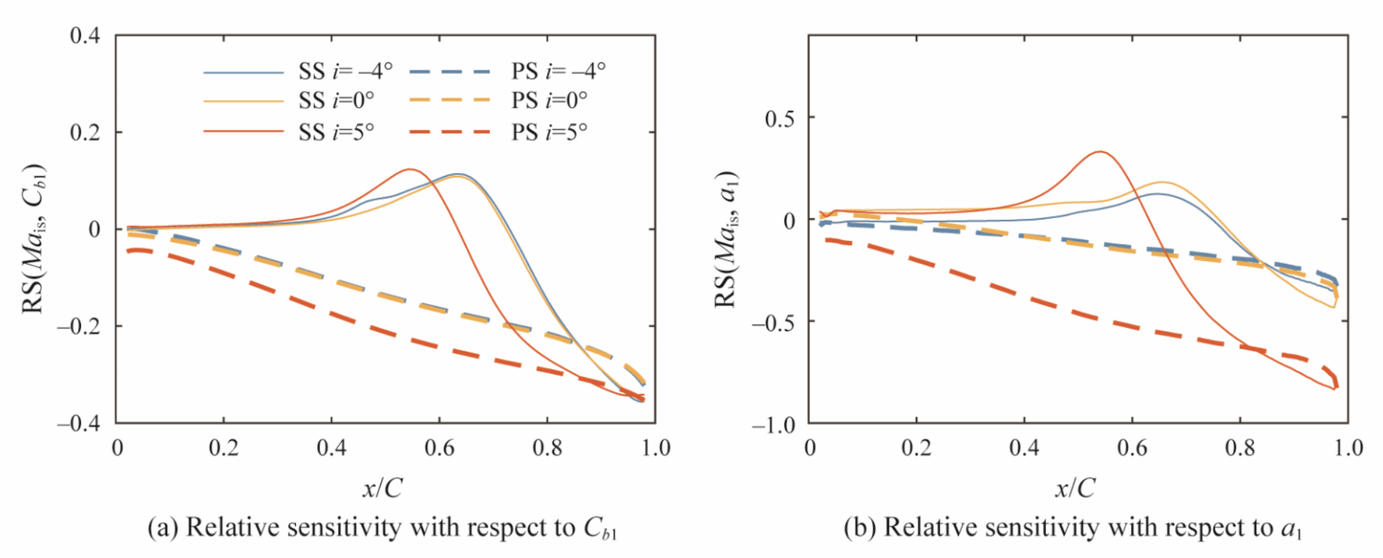 参数校正的过程中主要修正了来流马赫数Ma、进气角i和S-A模型中Cb1和SST模型中a1系数,其他参数由于对校正结果影响较小没有被修正,为了显示被修正的系数的在校正结果中起到的作用,定义了参数的相对敏感性RS和绝对敏感性AS,对被修正参数进行了敏感性分析。