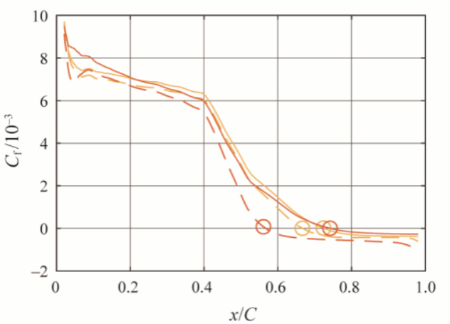 图7 湍流模型参数校正前后吸力面剪切力系数分布及分离点(圆圈)