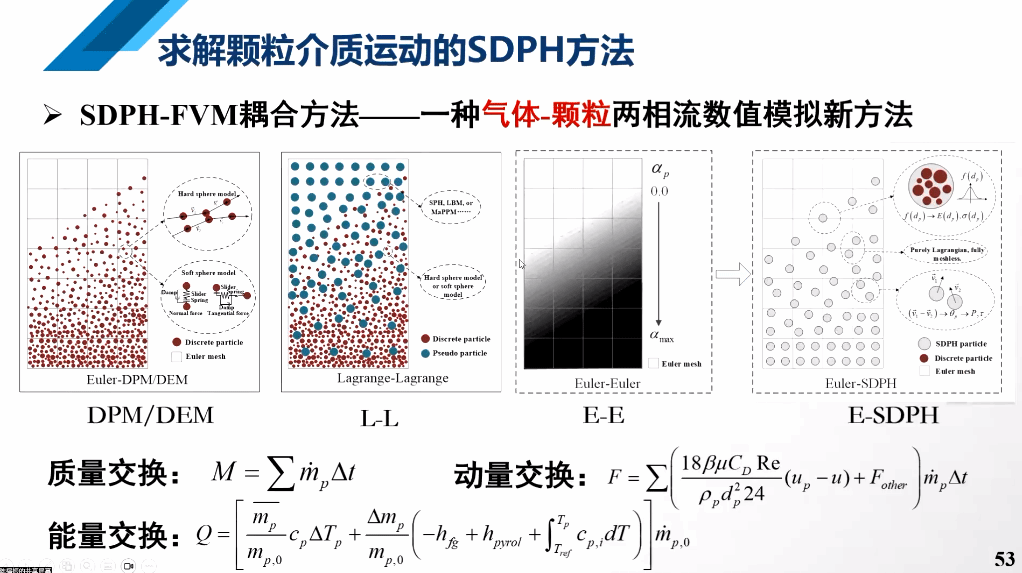 随后,针对前面的颗粒介质相态演变理论,陈教授提出了一种求解颗粒介质运动的SDPH方法。传统SDPH方法主要是求解连续性的流体或者固体,在此基础上,陈老师提出了求解离散颗粒的光滑粒子动力学方法。并且在SDPH方法的基础上提出气体-颗粒与液体-颗粒两相流数值模拟的新方法,经过数值验证,提出的求解方法效果非常好。
