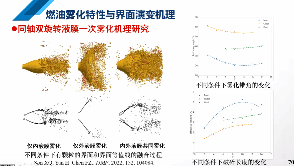 接着,陈福振教授介绍了燃油雾化特性与界面演变的机理,通过对双股旋转液膜与单股旋转的液膜雾化机理的对比研究,发现双股离心式的雾化模式有很大优势。并且针对雾化的模拟问题,提出了大涡模拟与网格自适应技术相结合的方法,模拟效果良好。