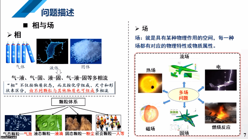 陈福振教授首先介绍了本次报告的研究背景。其研究可以归结为三类基础科学问题:第一类是气体液体两相流,核心是界面的问题;第二类是流体颗粒两相流,其难点在于考虑颗粒的相互作用力的话,计算难度非常大;第三类是多相流与多物理场的耦合问题,其难点在于多物理场之间存在相互转换。针对以上痛点难点,陈老师从数值方法以及物理机理和规律方面进行的了深入研究。