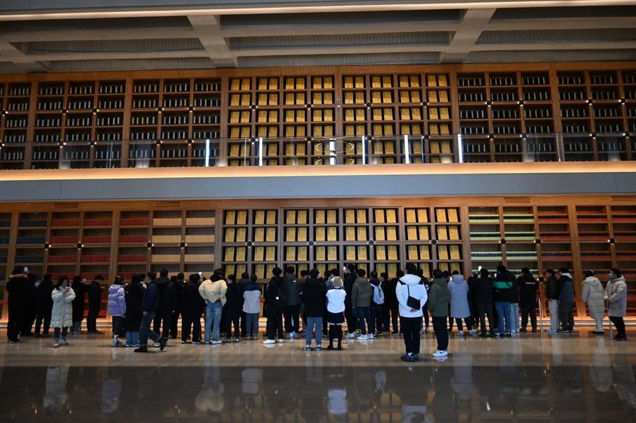 党员同志们跟着讲解员的步伐,首先来到了文济厅,映入眼帘的是一面金碧辉煌的书墙,大家不约而同被眼前的景象震撼了。文济厅是西安分馆最大的单体藏书空间,高20米,东西宽90米,其中打造了一面1800平米的书墙,陈列精品图书5万余册,有《永乐大典》200余册,仿真卷轴8000余卷等中国传统文化经典著作近万册,以及历代著名藏书楼和著名图书馆馆藏方志、地方志类图书等2.5万余册。同时精心设计了天禄、麒麟两尊铜铸瑞兽,置于书墙两侧,守护著典籍版本。“在这宏伟的书墙面前,仰望中华五千年浩瀚文明典籍,我感到十分自豪。”一位老师不由得发出了感叹。